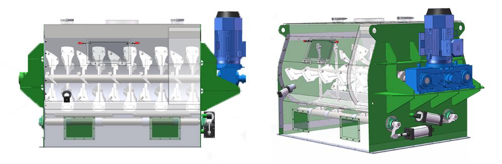 4-10m³雙軸無重力混合機由臥式筒體、傳動機構、雙軸攪拌槳葉組成;工作時,雙軸相對反向旋轉帶動不同角度的槳葉將物料沿軸向、徑向循環翻動,在高線速度的作用下物料被拋起處于失重(即無重力)狀態后落下,拋起和落下時物料交叉混合達到均勻。出料口分為大開門式,出料快捷無殘留。本機的優點是適用范圍廣、混合均勻度高、混合時間短。